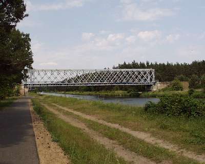 ![]() Die Kanalbrücke bei Oranienburg von Süden. Links im Bild der Fernradwanderweg Berlin-Kopenhagen. |
